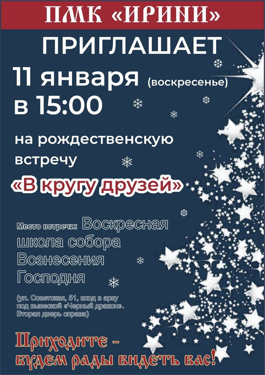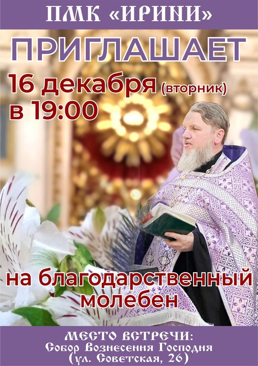 16 декабря (вторник) в 19.00 в Соборе Вознесения Господня (ул.Советская,26) участники ПМК «Ирини» с иереем Сергием Шерстобитовым соберутся на Благодарственный молебен