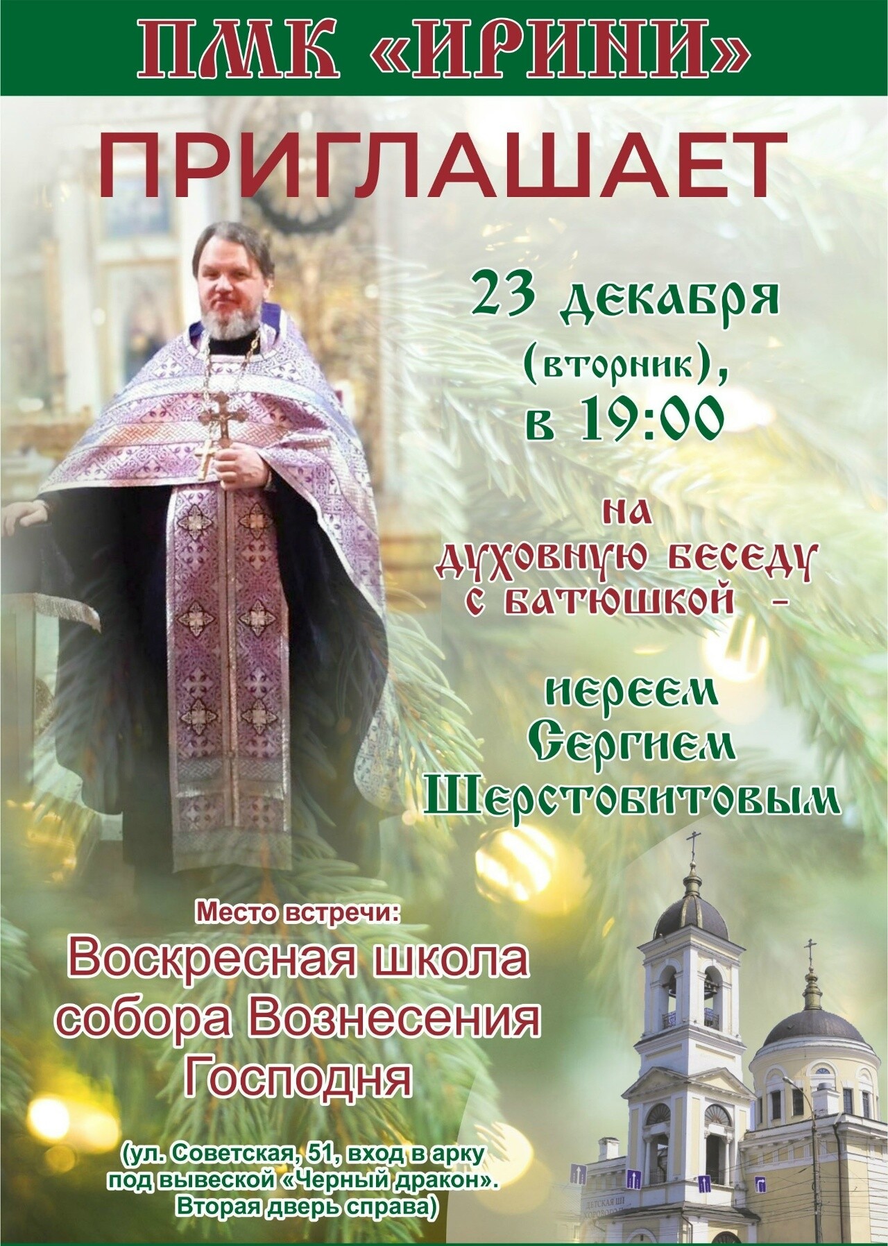 14 октября (во вторник) в 19.00 в ПМК “Ирини” состоится духовная беседа с руководителем клуба отцом Сергием Шерстобитовым на тему «Как не потеряться на пути спасения?»