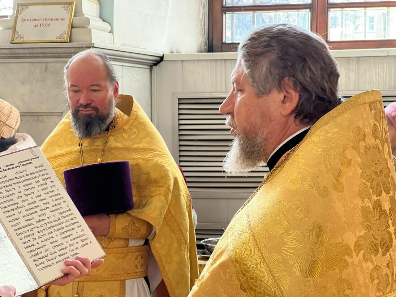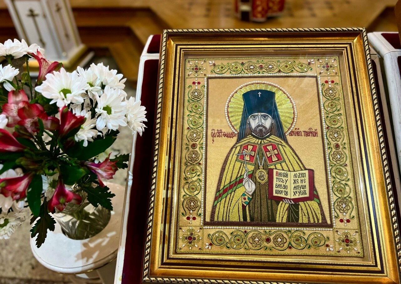 Священник подробно рассказал гостям историю храма, уделив особое внимание жизни и подвигам священномученика Фаддея (Успенского), архиепископа Тверского.